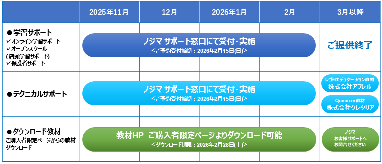 この度、ご愛顧いただいておりますノジマ プログラミング教材シリーズの販売終了に伴い、教材に付帯しております「オンライン学習サポート」「オープンスクール(ノジマ店頭学習サポート)」「保護者サポート」のご提供を、2026年2月末日をもって終了する運びとなりました。